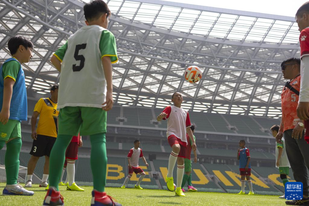 6月1日,在北京工人體育場,藏族孩子與國安少年足球隊隊員訓(xùn)練交流。新華社記者 才揚 攝