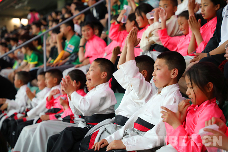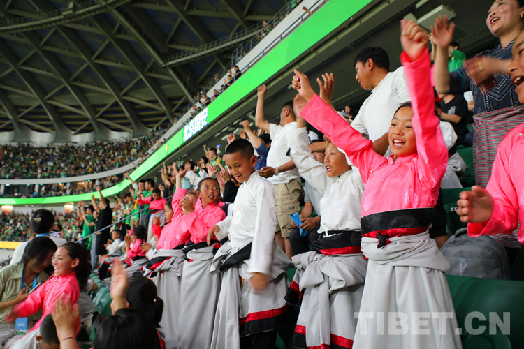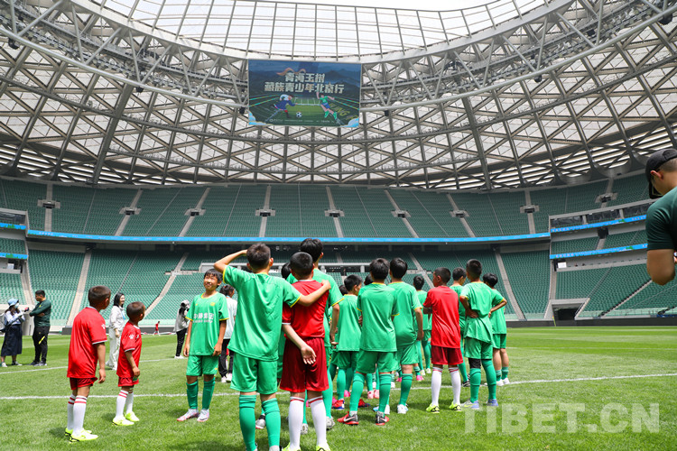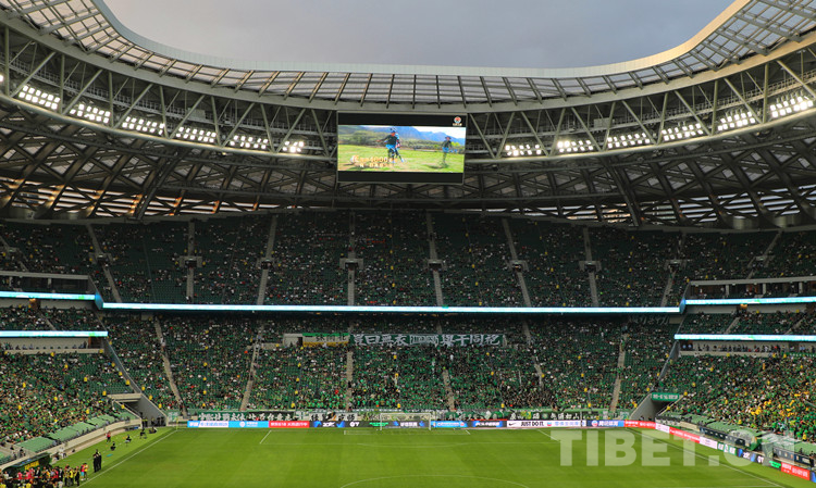 阿斌與5名小伙伴身著藏裝,牽手球員出現(xiàn)在賽場上,頓時吸引了全場目光。大屏還播放著三江源·北京情·中國心——青海玉樹藏族青少年北京行”的視頻,展示著雪域足球少年的風(fēng)采,環(huán)形LED屏幕用中文、藏文雙語滾動播放著40位玉樹少年的名字。
