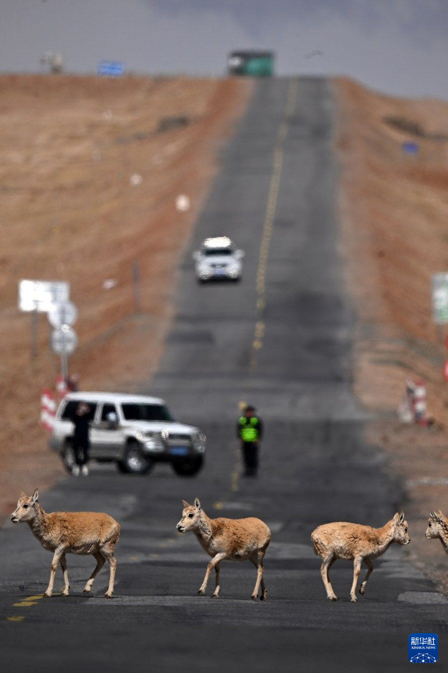 眼下,可可西里藏羚羊進(jìn)入遷徙產(chǎn)仔高峰期,記者近日在青藏公路3001公里處看到,成群的雌性藏羚羊在公路一側(cè)集結(jié),現(xiàn)場的工作人員對(duì)往來車輛進(jìn)行臨時(shí)交通管制。頭羊反復(fù)試探、確認(rèn)沒有危險(xiǎn)后,羊群快速通過公路,向可可西里腹地奔去。