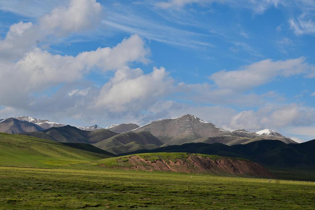 夏日,青海省南部的高原草原一碧千里,與雪山、白云相映成趣,景色宜人。