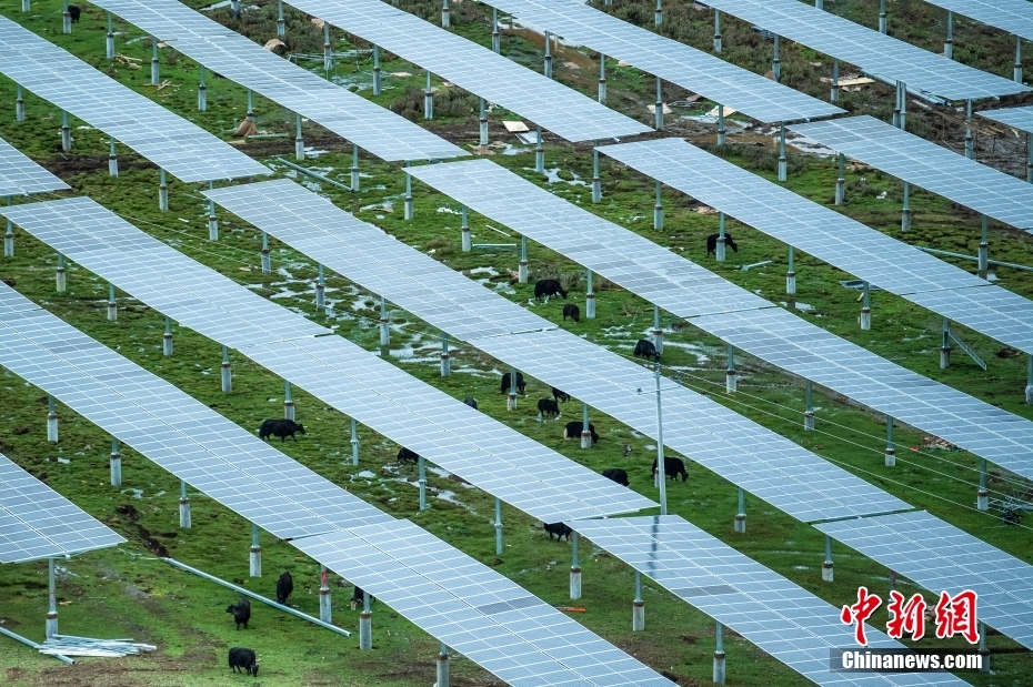 6月23日,光伏組件下一群牦牛正在吃草。