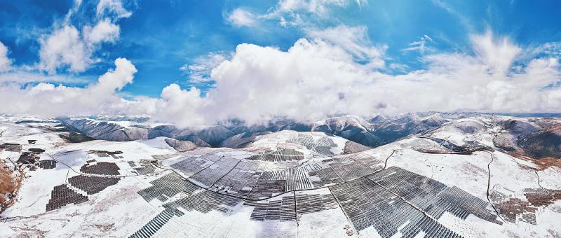 距兩河口水電站約50公里的柯拉一期光伏電站,200多萬塊光伏板將最高海拔4600米的扎拉托桑山裝點(diǎn)成一片“光伏?!?。