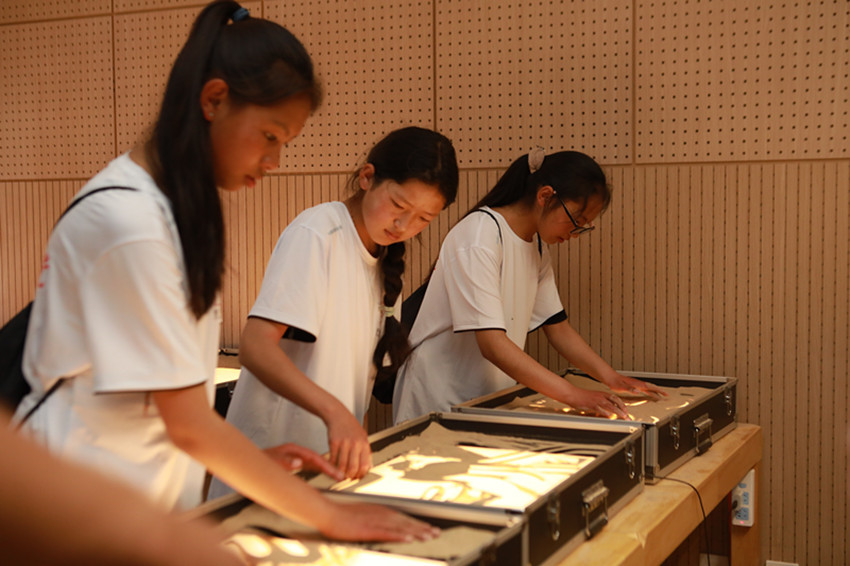 理塘青少年代表在錢塘區(qū)青少年活動中心體驗沙畫制作。