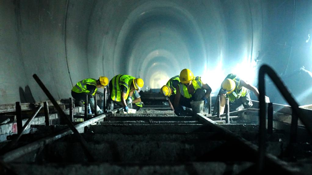 7月8日,滇藏鐵路麗香段哈巴雪山隧道內(nèi),建設(shè)者進(jìn)行無砟道床施工。新華社記者 丁怡全 攝