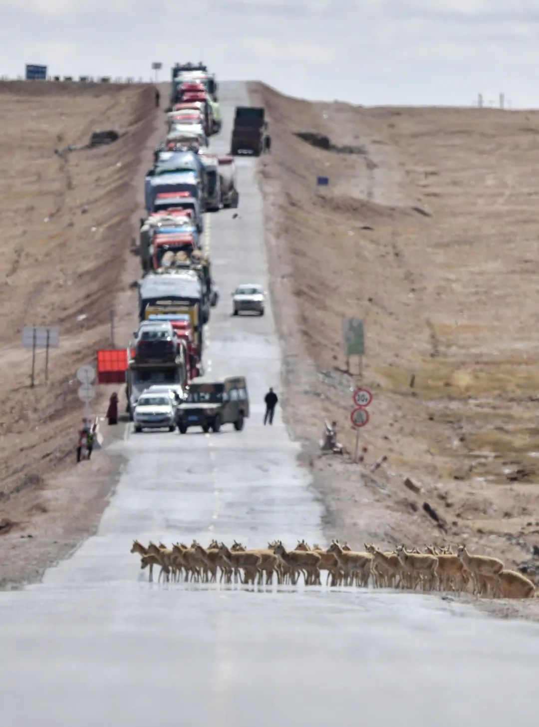 而在青藏公路這頭,可可西里管理處安排工作人員采取短暫交通管制、禁止鳴笛、巡護(hù)救助等措施,為藏羚羊遷徙產(chǎn)仔保駕護(hù)航。伴隨遷徙高峰期的到來,藏羚羊“過公路”已經(jīng)成為青藏公路沿線的一道獨(dú)特風(fēng)景。