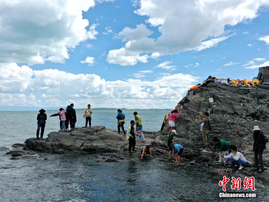 7月盛夏,在青海湖北岸的青海省海北藏族自治州境內(nèi)的青海湖斷崖,眾多省內(nèi)外游客聚集于此,一覽湟魚洄游季的生命奇景。青海湖斷崖視野開闊,可以遠望青海湖的湛藍色湖面和周圍的雪山山脈。懸崖峭壁屬于天然形成的地質地貌,是高于青海湖面十幾到二十米的小崖壁,當?shù)孛癖姵T诖诉M行祈禱和禱告。青海湖裸鯉俗稱“湟魚”,是青海湖中唯一的大型野生經(jīng)濟魚類,在青海湖“魚鳥共生”生態(tài)系統(tǒng)中發(fā)揮著獨特、核心作用。2004年青海湖裸鯉被列入《中國物種紅色名錄》瀕危物種名單中。每年7月前后,瀕危物種青海湖裸鯉進入洄游季,密密麻麻的青海湖裸鯉集中在青海湖斷崖岸邊,頗為壯觀。
