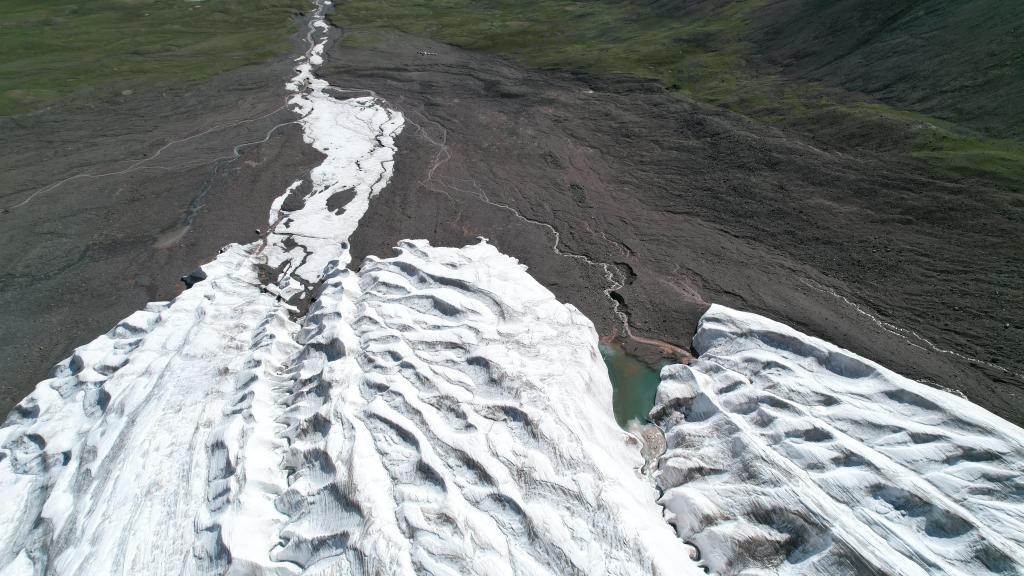 2022年江源綜合科學(xué)考察隊(duì)曾對(duì)此冰川進(jìn)行地質(zhì)雷達(dá)探測(cè),通過布設(shè)一維測(cè)線獲取冰川前緣的冰厚數(shù)據(jù),以及冰下地形走勢(shì)。今年在相同位置進(jìn)行探測(cè),增加了兩個(gè)二維測(cè)網(wǎng)的布設(shè),獲取的數(shù)據(jù)用于對(duì)比一年來冰川前緣冰厚和冰下地形的變化,計(jì)算測(cè)網(wǎng)內(nèi)準(zhǔn)確的冰儲(chǔ)量,揭示氣候變化對(duì)冰川退化的影響,以及冰川運(yùn)動(dòng)對(duì)于冰下基巖的剝蝕特征。