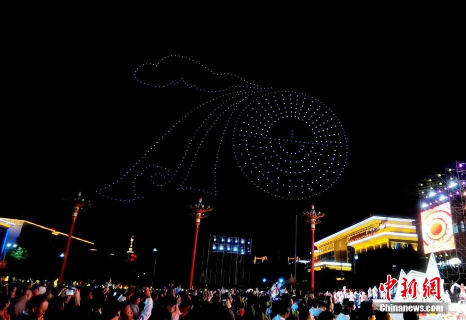 7月31日晚,青海省海南藏族自治州,800余架無人機騰空而起,以夜空為畫布,以燈光為畫筆,組成“光伏羊”“揚帆起航”“防沙治沙”“扎西德勒(藏語,意為吉祥如意)”等字樣,慶祝青海省海南藏族自治州成立70周年。