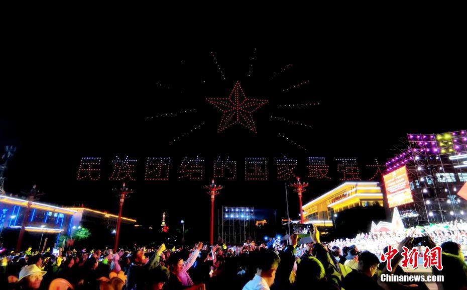 圖為無人機秀現(xiàn)場,無人機組成“民族團結(jié)的國家最團結(jié)”字樣。祁增蓓 攝