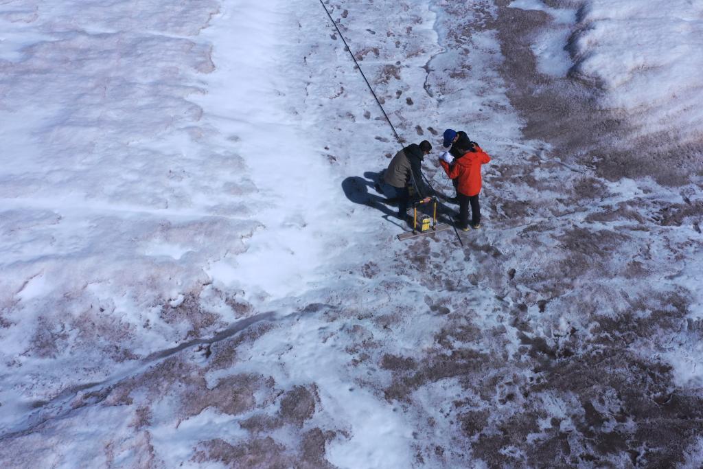 7月27日,范越(左一)和董士琦(左二)在長江源區(qū)的冬克瑪?shù)妆ㄉ鲜褂玫刭|(zhì)雷達探測冰川厚度(無人機照片)。新華社記者 陳杰 攝