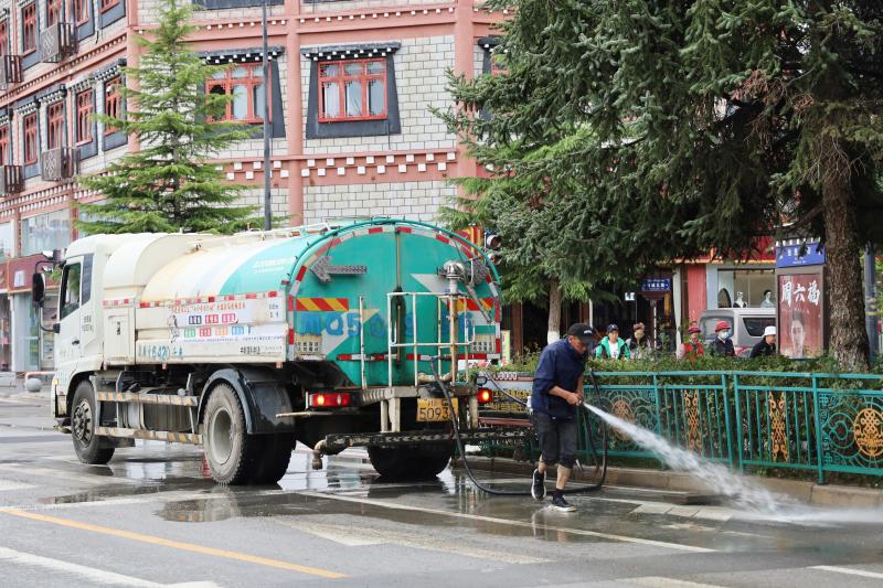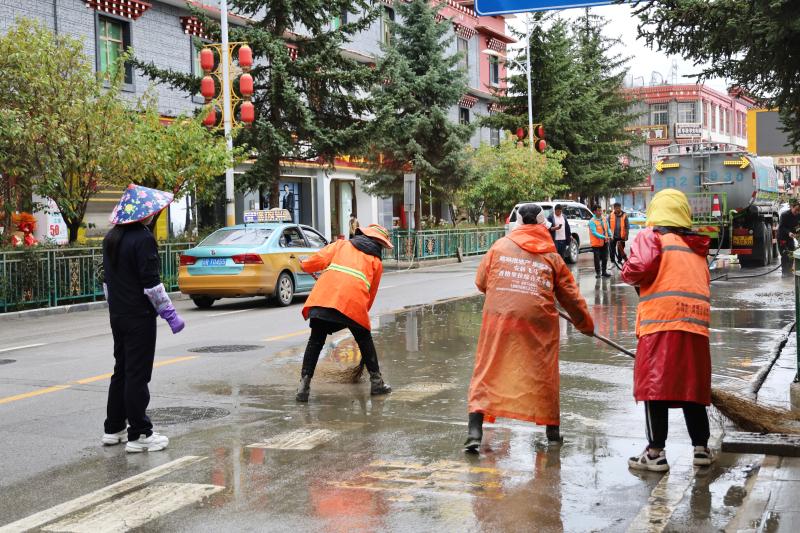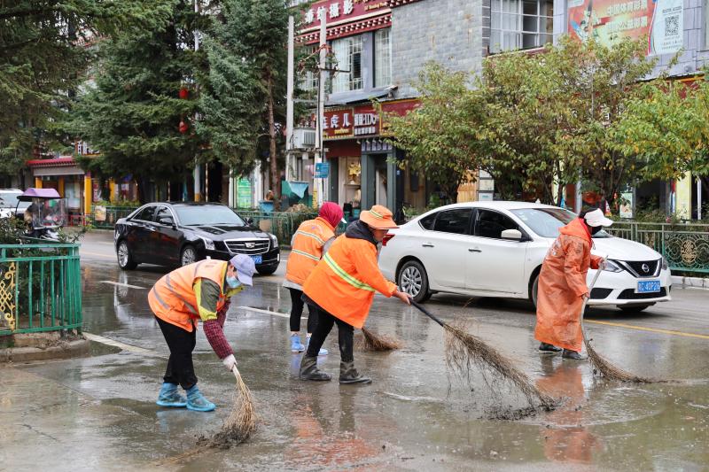 為盡快恢復(fù)城區(qū)潔凈容貌,香格里拉市和祥環(huán)??萍加邢挢?zé)任公司立即組織環(huán)衛(wèi)工人30名,抽調(diào)高壓水車2輛、掃地車4輛,積極開展道路清淤工作,同時(shí)對(duì)下水道水口周邊的樹枝、雜物等進(jìn)行清理清運(yùn)。經(jīng)過(guò)近五小時(shí)的連續(xù)作業(yè),成功恢復(fù)道路暢通整潔。
