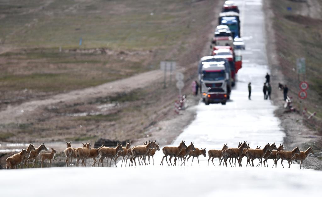 一群待產(chǎn)雌性藏羚羊在通過青藏公路前往可可西里卓乃湖產(chǎn)仔(5月28日攝)。新華社記者 張宏祥 攝