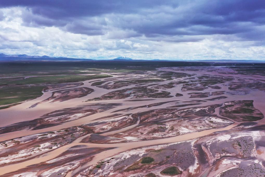 風(fēng)雪彌漫中的當(dāng)曲濕地(7月24日攝,無人機(jī)照片)。新華社記者 劉詩平 攝