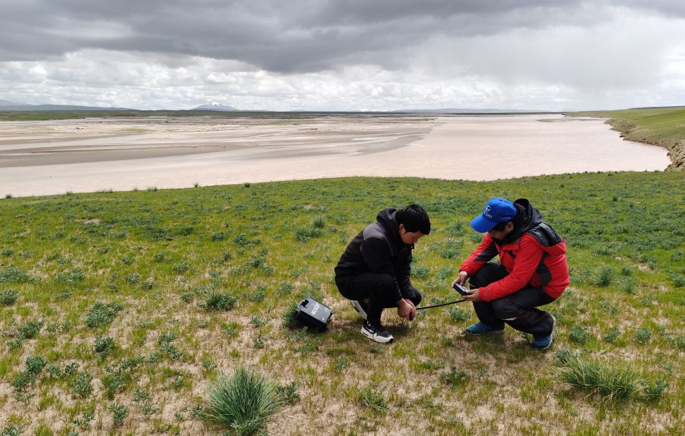 科考隊員董士琦(左)和范越在長江北源楚瑪爾河附近進(jìn)行地質(zhì)雷達(dá)探測(7月29日攝)。新華社記者 陳杰 攝