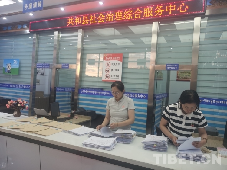 圖為青海省海南藏族自治州共和縣社會(huì)治理綜合服務(wù)中心工作人員為群眾進(jìn)行調(diào)解