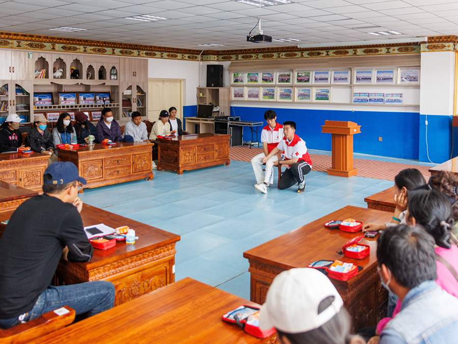 浙江海洋大學(xué)支教隊(duì)成員在為囊謙縣第二完全小學(xué)的孩子們進(jìn)行應(yīng)急救護(hù)課堂教學(xué)。(受訪者供圖)