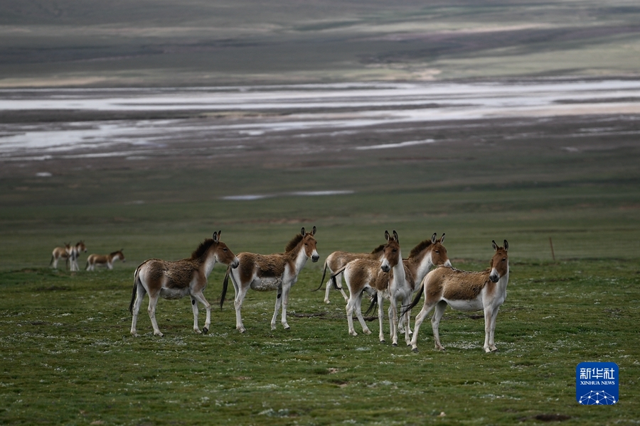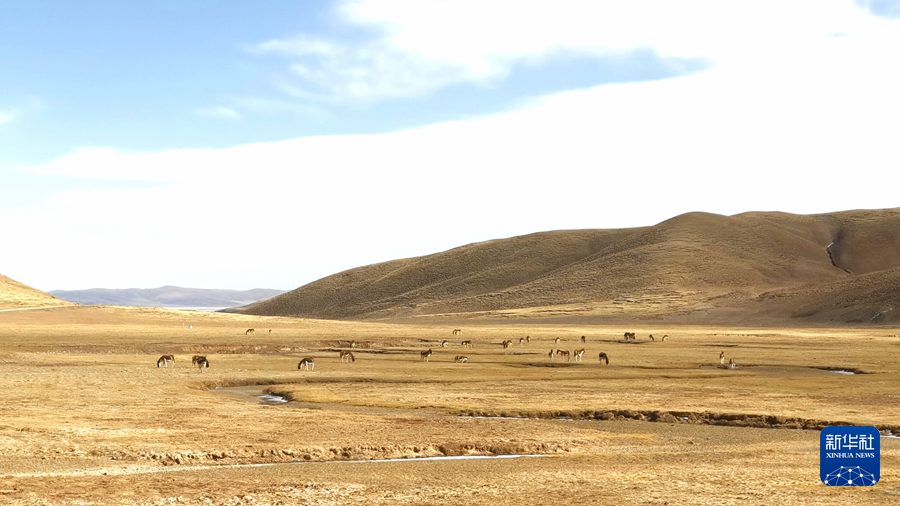 2022年3月12日,在三江源國(guó)家公園黃河源園區(qū)內(nèi),一群藏野驢在草灘上吃草。新華社記者 呂雪莉 攝
