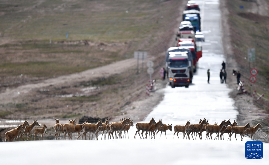 一群藏羚羊通過(guò)青藏公路前往青海三江源地區(qū)(2023年7月28日攝)。新華社記者 張宏祥 攝