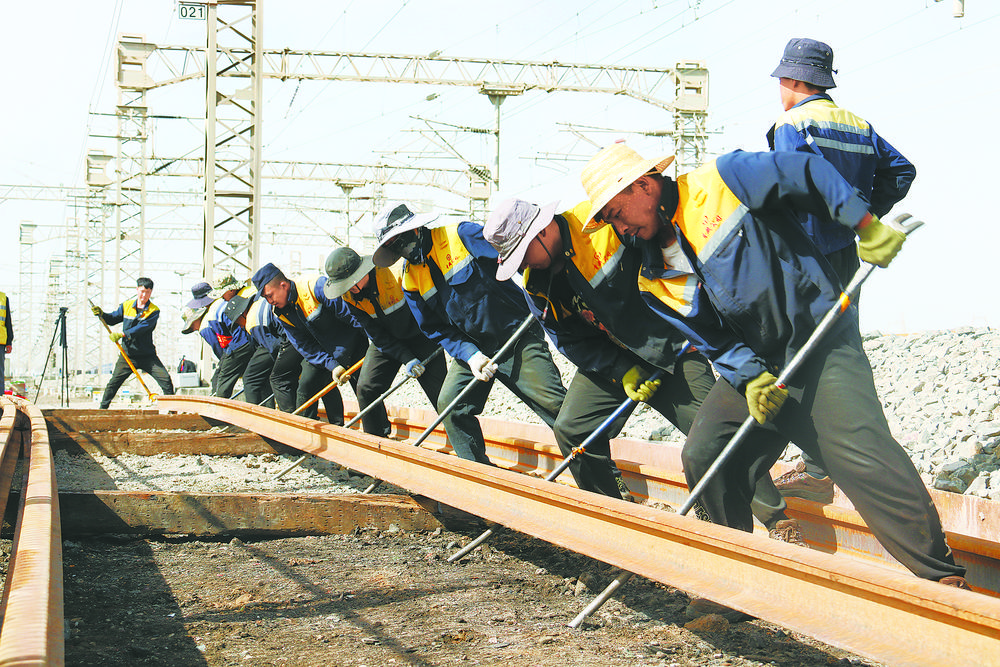察爾汗線路車(chē)間職工在擺正鋼軌。東科力加 攝