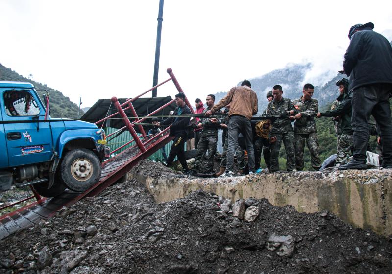 “同志,不要怕,我們是武警官兵,我們先給你處理傷口?!?甕云飛一邊安撫受傷群眾的情緒,一邊為他消毒止血、包扎傷口。后經(jīng)檢查,該群眾除了頭部有輕微皮外傷外,全身并無大礙。之后,中隊官兵又和當?shù)厝罕娨黄鹜度胲囕v緊急救援,經(jīng)過幾個小時的努力,大家齊心協(xié)力將貨車拖至安全地帶。