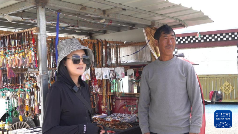 圖為噶通鎮(zhèn)白中村村民崩秋澤仁(右)在攤位前。楊鎧樂 攝