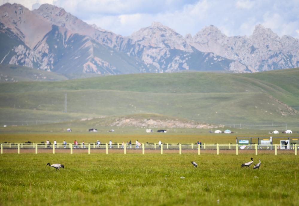 這是在四川省阿壩藏族羌族自治州若爾蓋縣花湖濕地拍攝的黑頸鶴。新華社記者 王曦 攝