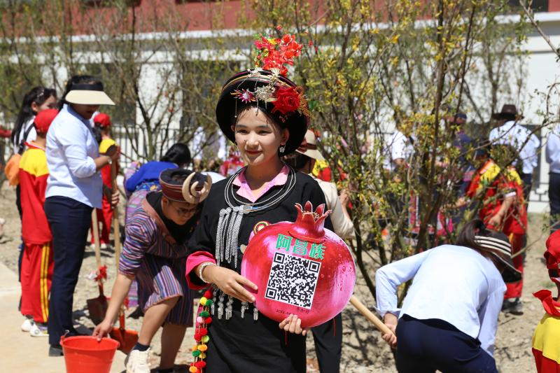 秋陽(yáng)下,56個(gè)民族嘉賓與德欽縣領(lǐng)導(dǎo)干部、老師、學(xué)生互相協(xié)作,培土、澆水,合力種下石榴樹(shù),并在各自種植的石榴樹(shù)上掛上本民族的標(biāo)記牌?!昂軜s幸能夠與全國(guó)各民族的兄弟姐妹們一起參與到這場(chǎng)加強(qiáng)各民族交往交流交融的盛事中來(lái),這片生機(jī)盎然的石榴林讓我看到了民族團(tuán)結(jié)的強(qiáng)大力量,我們各民族一定會(huì)像石榴籽一樣緊緊抱在一起,共同奔向更美好的生活?!眮?lái)自新疆的烏孜別克族嘉賓江阿古麗·木哈買(mǎi)提加爾激動(dòng)地說(shuō)。