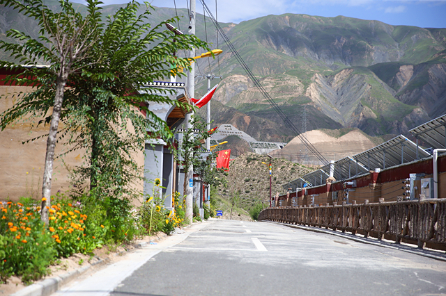 爬上來玉村南側(cè)坡頂,腳下99棟藏式院落沿著河岸的緩坡錯落有致,寬闊的瀝青路通往家家戶戶院門口,屋頂?shù)木爸屡c德吉村別無二致。