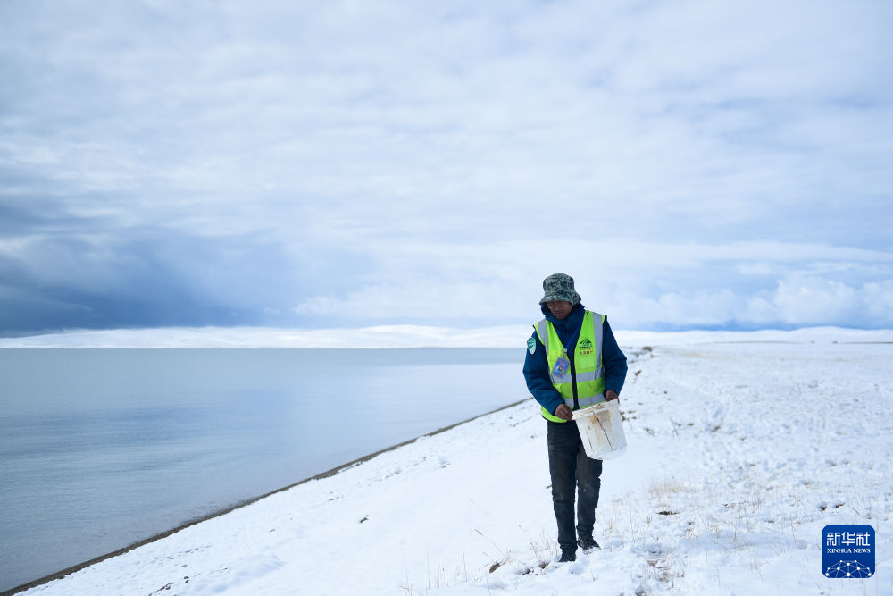2021年10月20日,在青海省果洛藏族自治州瑪多縣扎陵湖鄉(xiāng)勒那村,三江源國(guó)家公園黃河源園區(qū)生態(tài)管護(hù)員在扎陵湖邊撿拾垃圾。新華社記者張龍 攝