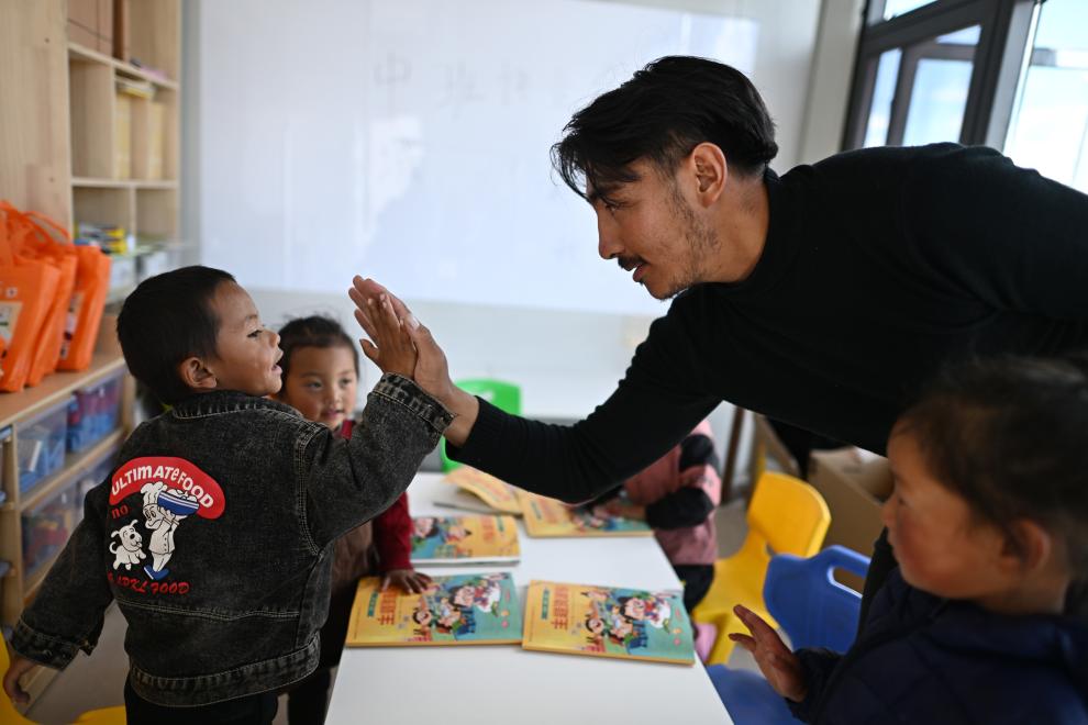 在曲麻萊縣秋智鄉(xiāng)布甫村陽光幼兒園,秋智鄉(xiāng)幼兒園副園長才仁戰(zhàn)斗(右二)在課堂上和小朋友互動(9月14日攝)。新華社記者 張宏祥 攝