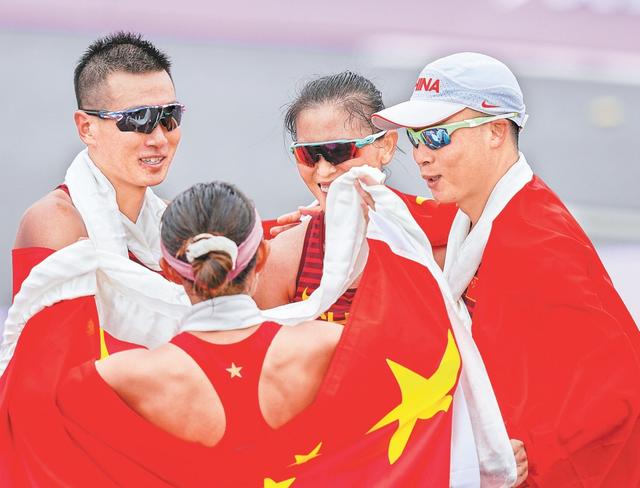 男女混合35公里競(jìng)走團(tuán)體決賽中,中國(guó)隊(duì)以5小時(shí)16分41秒的成績(jī)獲得冠軍,日本隊(duì)獲得亞軍,印度隊(duì)獲得季軍。圖為中國(guó)隊(duì)選手在奪冠后慶祝。 新華社記者 孫非攝