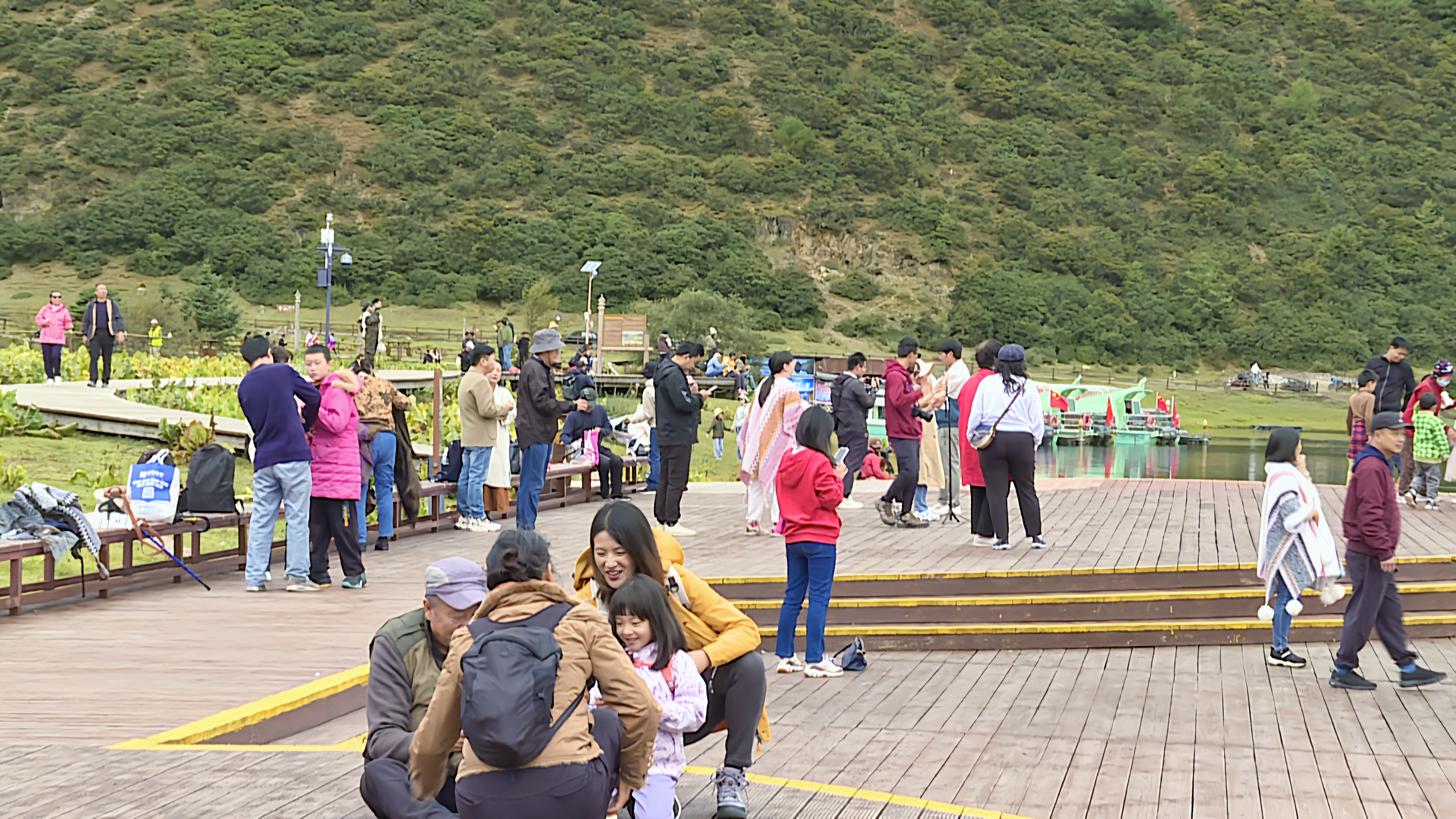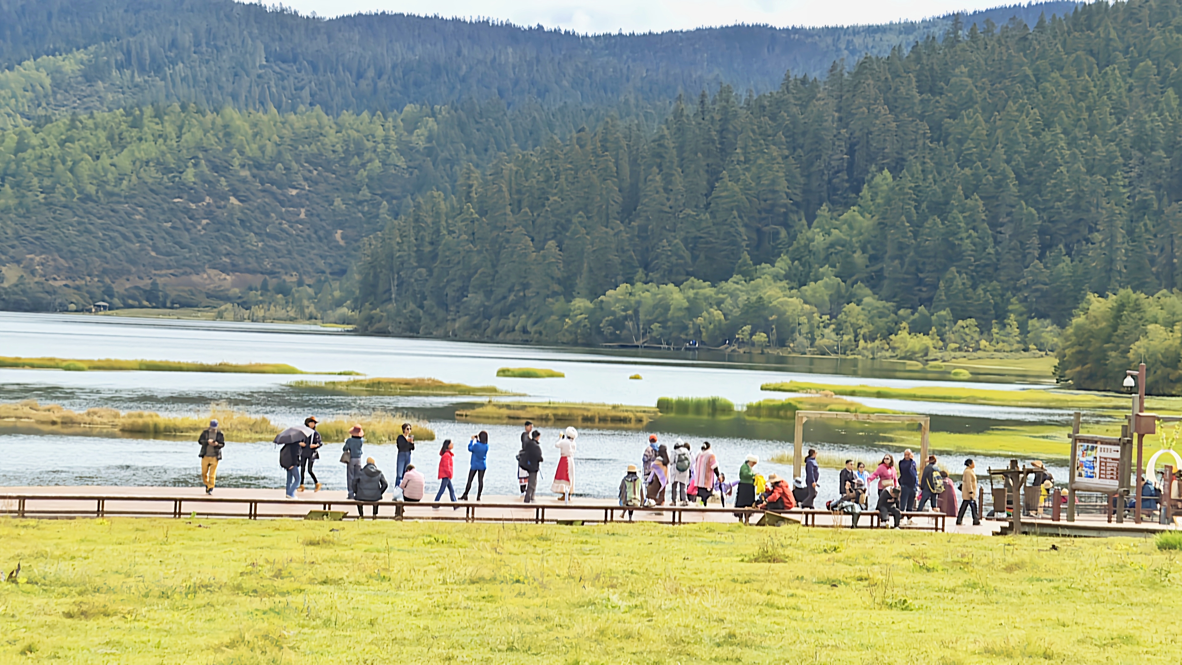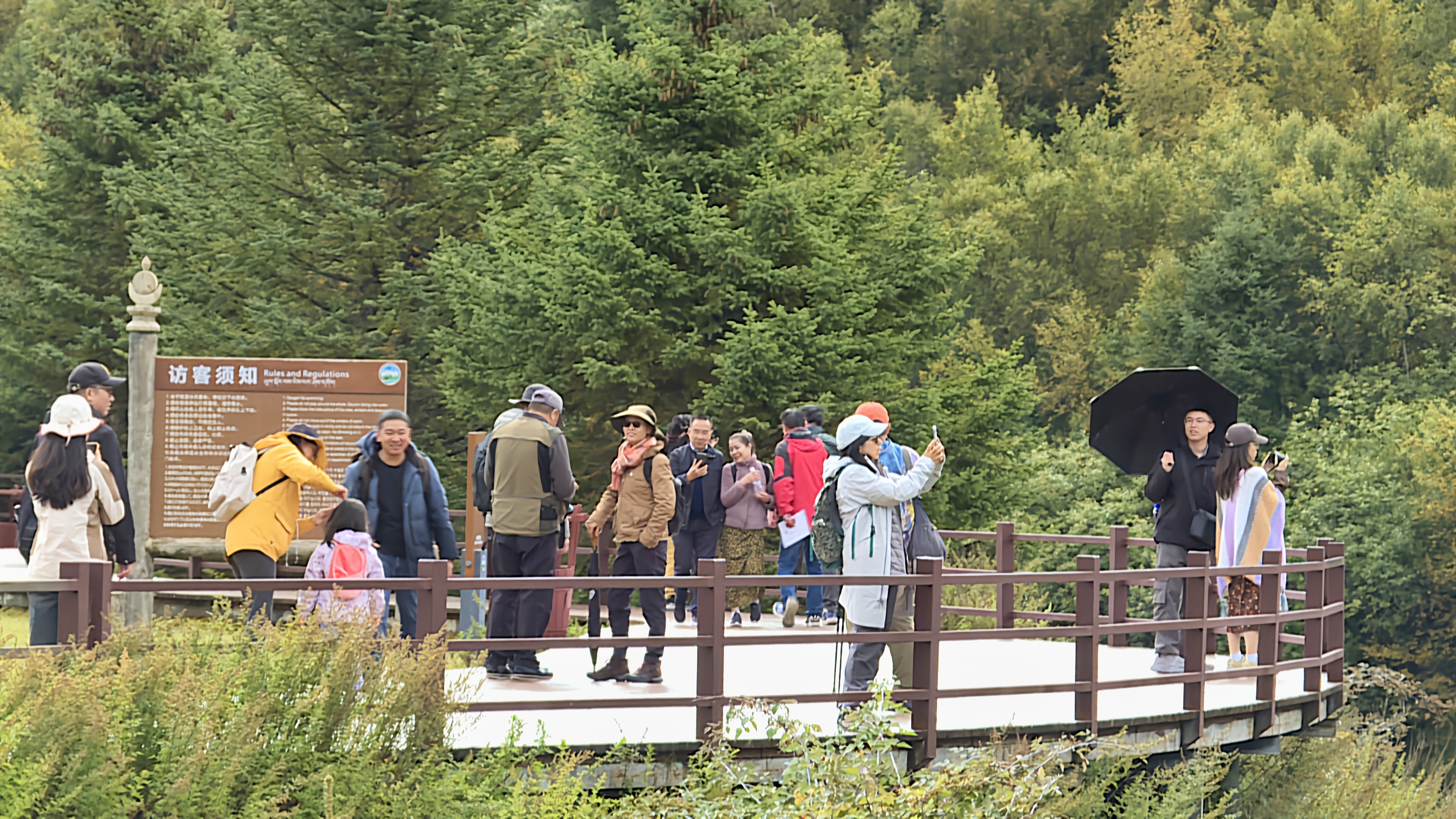 秋日的普達(dá)措國家公園層林盡染、色彩斑斕,高山草甸、原始森林與湖泊濕地構(gòu)成了一幅幅美麗的畫卷,屬都湖棧道上人群熙熙攘攘?!拔沂堑谝淮蝸硐愀窭锢糜危愀窭锢o我的感覺就是,這里的生態(tài)環(huán)境保護(hù)得很好,綠水青山,很值得來游玩?!庇慰退闻勘硎尽?/p>