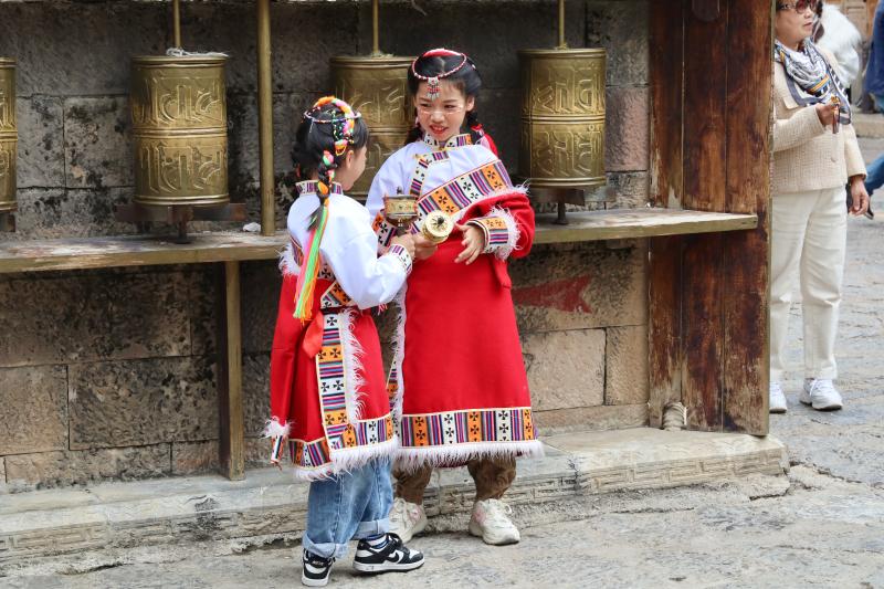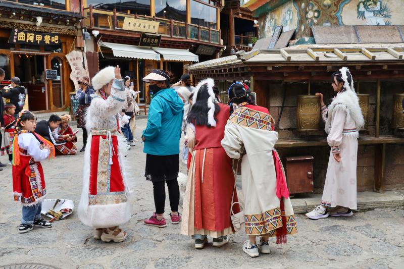 長假期間,獨克宗古城又掀起旅拍熱。走在獨克宗古城里,隨處可見身著藏族服飾、妝容精致的俊男靚女?!耙昏髷z影”店內(nèi),選服飾、選配飾、做妝造......來來往往的顧客絡(luò)繹不絕,“最近每天服務(wù)單數(shù)在四五十單左右,是長假之前的一倍多?!币昏髷z影的負責(zé)人說道。經(jīng)過化妝造型,游客們即刻變身美麗帥氣的卓瑪扎西,獨具民族特色的造型,配以古城的美景,深受游客的喜愛,大家紛紛以旅拍的方式給自己在旅途中留下一份美好的回憶。