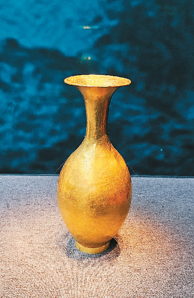 日前開展的“青海都蘭熱水墓群精品文物展”展出的的金胡瓶。 趙曉霞 攝