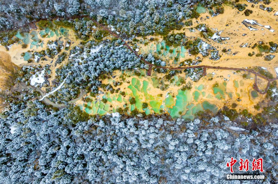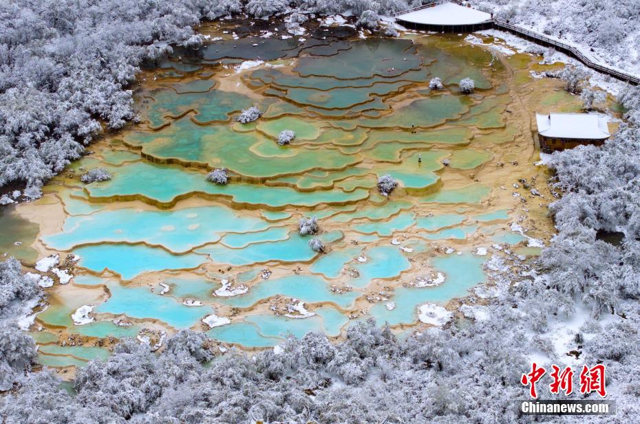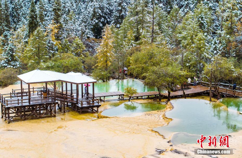10月12日,被譽為“人間瑤池”的四川松潘黃龍景區(qū)迎來降雪。白雪覆蓋了彩池旁的原始森林、棧道、古寺,白雪與池水相映,宛如童話世界。