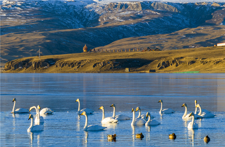 冬日的青海湖,一碧千里沒有雜色。湖面像一層薄薄的透明玻璃,晶瑩剔透,湖岸周圍是金黃的草場,遠(yuǎn)處是高聳入云的雪峰,潔白的天鵝恰似水中仙子,伸展雙翼,引翅拍水,蕩漾著水波,構(gòu)成一幅冬日美景圖。