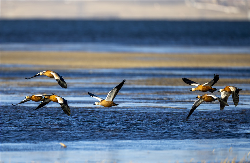 赤麻鴨在湖面飛翔。楊濤 攝