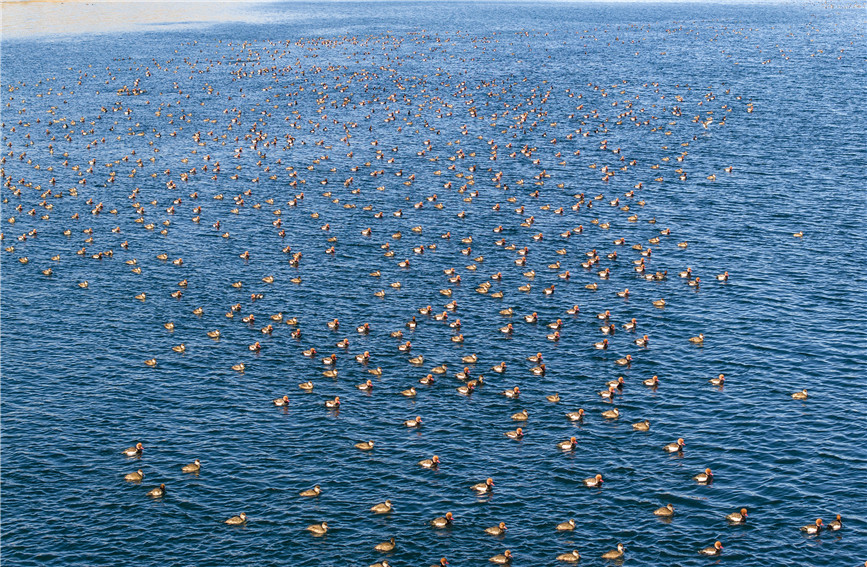 成群結(jié)隊的赤嘴潛鴨在湖面嬉戲。楊濤 攝