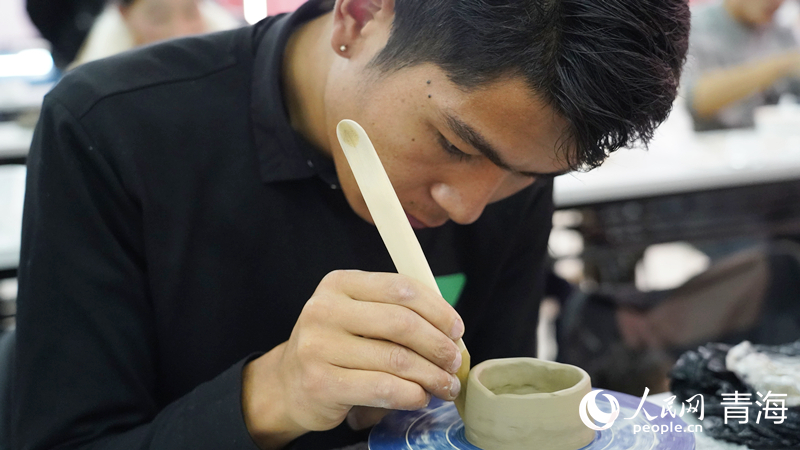 “平時家里開鋪子做生意,每月利潤也有四五千。最近鋪子生意不太忙,跟妻子一起來學(xué)習(xí),學(xué)會了也可以自己制作黑陶,增加收入?!苯鸫氲恼煞蚓妥谂赃?,邊打磨坯體上沿,邊講述自家情況,一件碗狀的坯體即將完工。