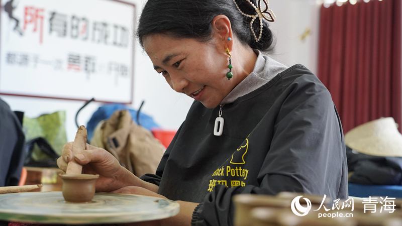 “在這兒既能在老師的指導(dǎo)下免費(fèi)學(xué)到黑陶制作技藝,還能帶孩子。”青海省果洛藏族自治州班瑪縣瑪可河鄉(xiāng)牧民金措正在打磨一件黑陶器皿,姑娘就坐在旁邊,時而玩泥巴,時而喝牛奶,一雙大眼睛好奇地觀察著四周。