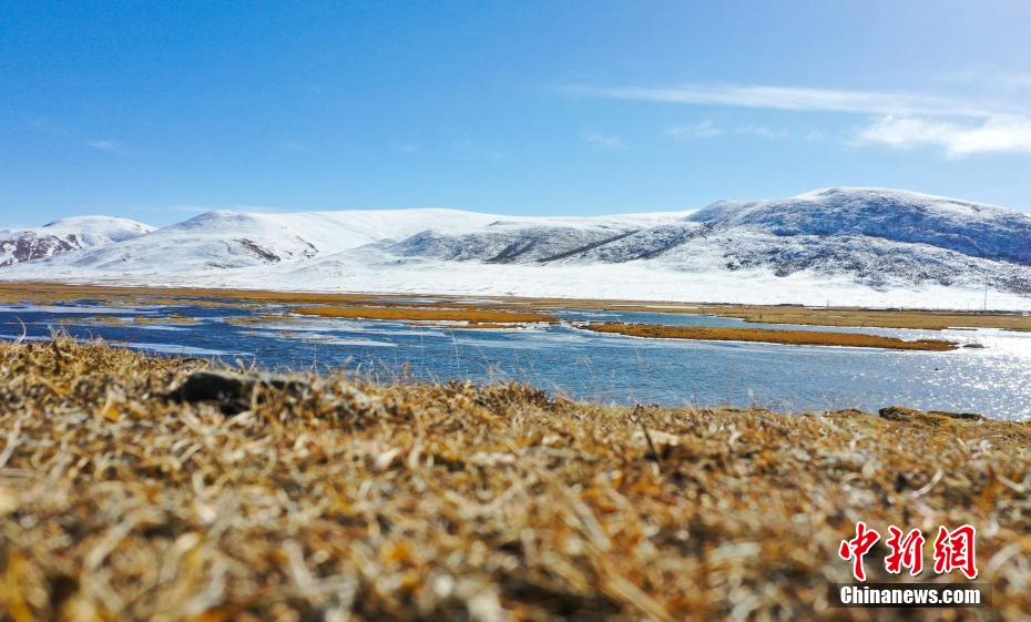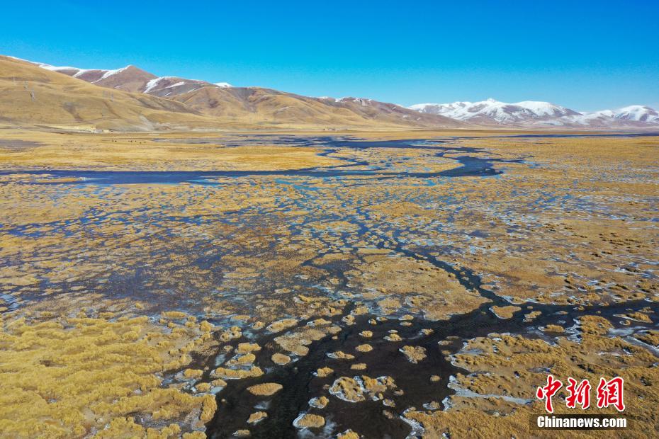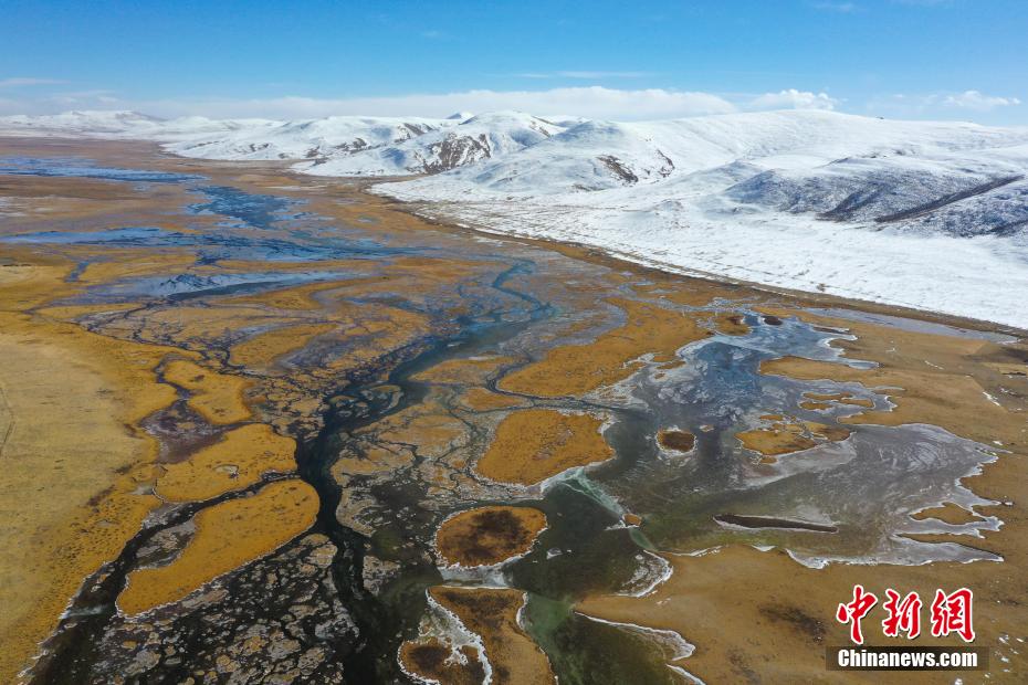 11月15日,航拍青海玉樹隆寶灘國(guó)際重要濕地冬日旖旎景色。降雪過后,位于青海省玉樹藏族自治州玉樹市境內(nèi)的隆寶灘國(guó)際重要濕地連綿的山巒被白雪覆蓋,與金色的草地和蜿蜒的河流交相輝映,景色旖旎。