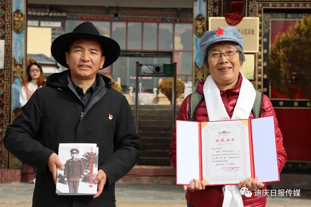 迪慶紅軍長征博物館館長潘高原代表博物館接收了這些珍貴的革命資料、實(shí)物,向他們授予了榮譽(yù)證書并在博物館前合影留念。