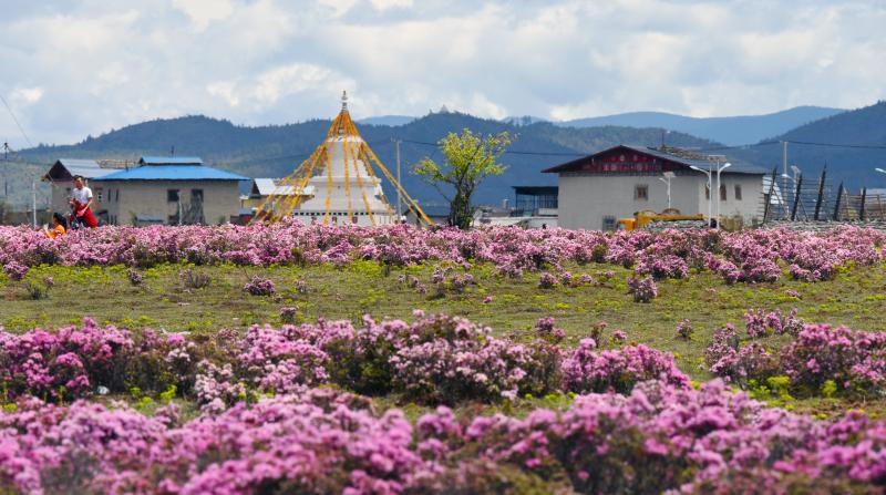 每年5月下旬至6月中旬,小中甸草原就會(huì)被多彩絢爛的杜鵑花、狼毒花以及各種不知名的小花小草包圍,變成一片花的海洋,吸引來(lái)自各地的游客駐足。這時(shí)的小中甸,每個(gè)角度都是美景,花海連著傳統(tǒng)藏族民居,以及遠(yuǎn)處的雪山和森林,恍若走進(jìn)了神話中的仙境,這里也是人們拍寫真照、婚紗照的絕好取景地。