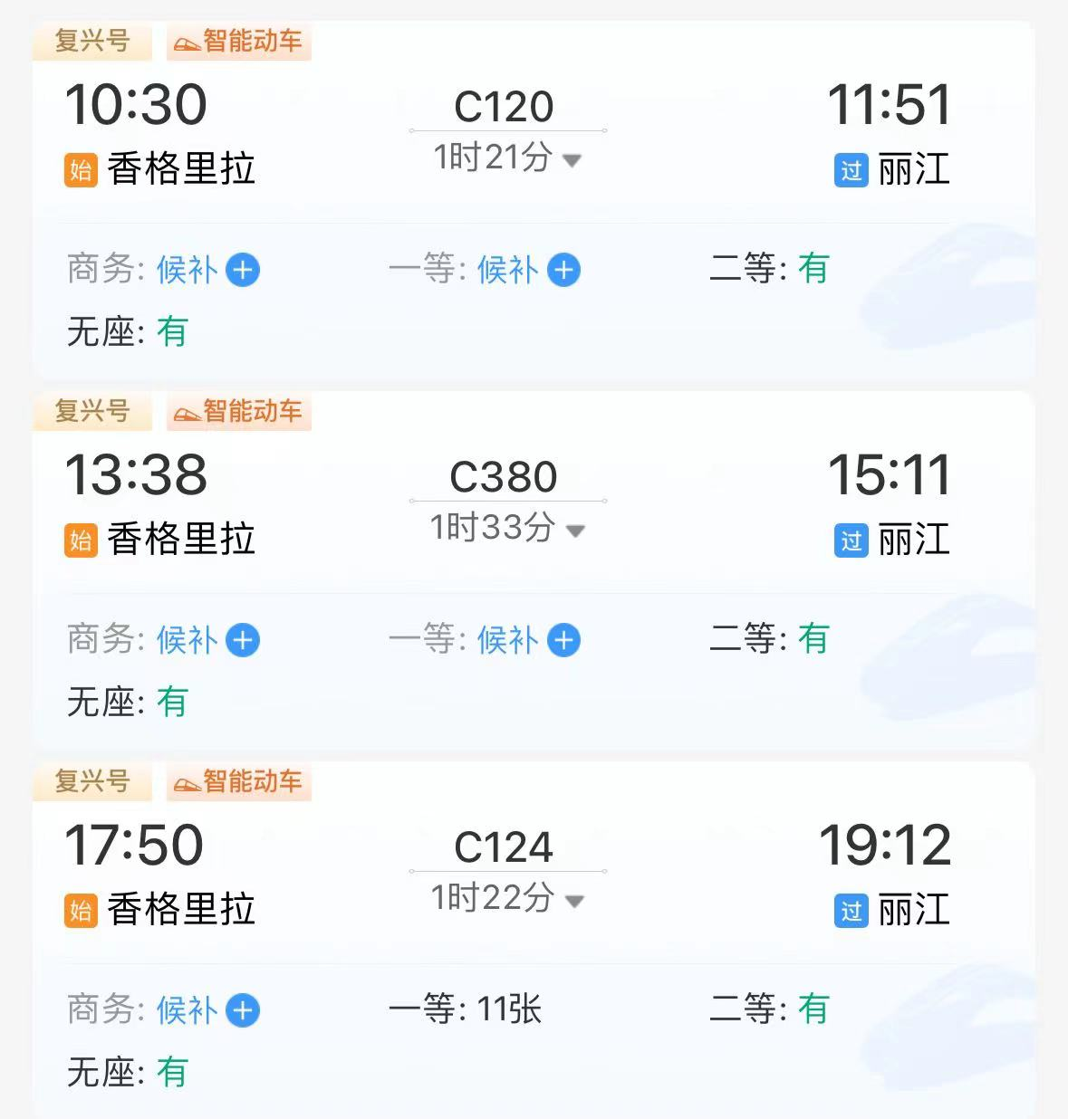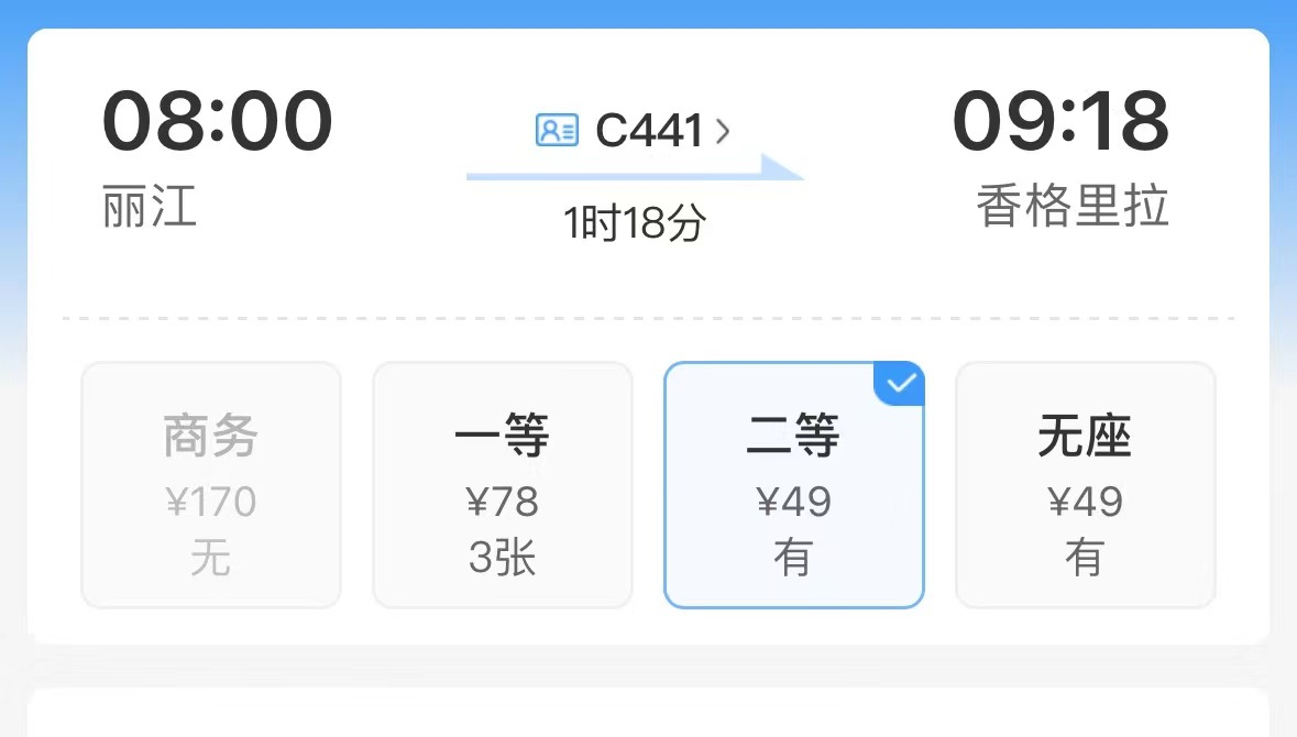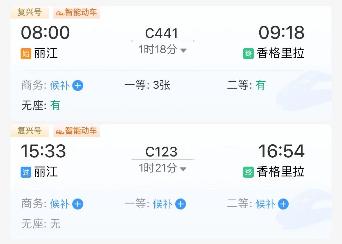 根據(jù)中國鐵路官方售票平臺-鐵路12306上的查詢結(jié)果,目前,麗江-香格里拉段每日共發(fā)出兩趟班次,最快1小時18分到達香格里拉站;香格里拉-麗江段每日共發(fā)出三趟班次,最快1小時21分到達麗江站。班次設(shè)置合理,基本可以保證上、中、下午時段的不同出行需求。