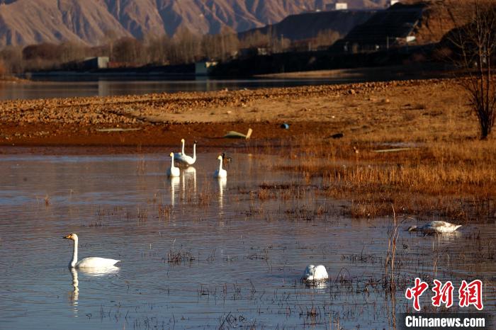 青海:野生大天鵝群在黃河越冬高原冬日添靚景
