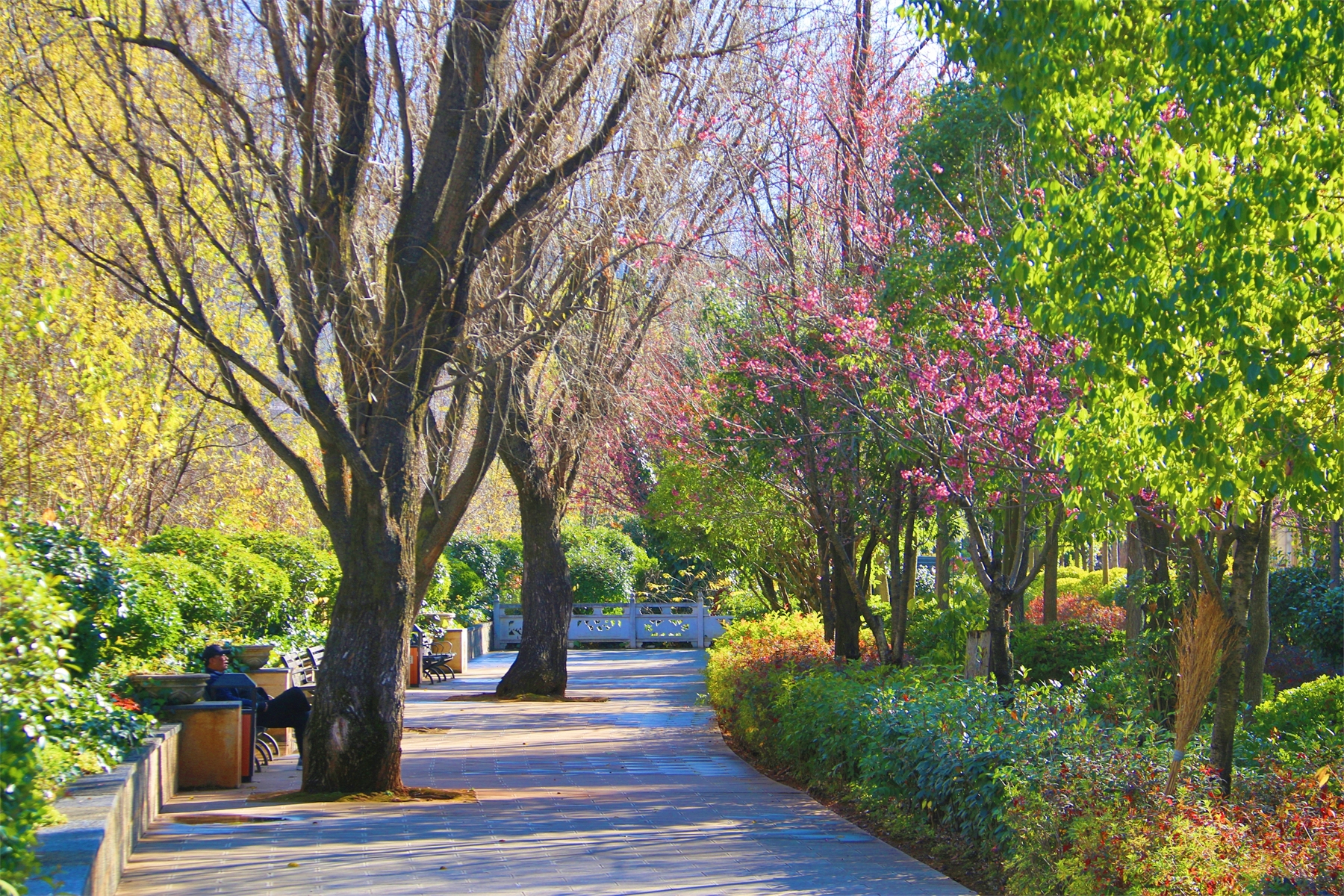 數(shù)九寒天,香格里拉產(chǎn)業(yè)園區(qū)卻是一幅暖冬畫(huà)面,陽(yáng)光和煦,綠樹(shù)成蔭,沿江步道兩側(cè)的一樹(shù)樹(shù)冬櫻開(kāi)滿粉紅的櫻花,蜜蜂穿梭期間,讓人仿佛置身春日。