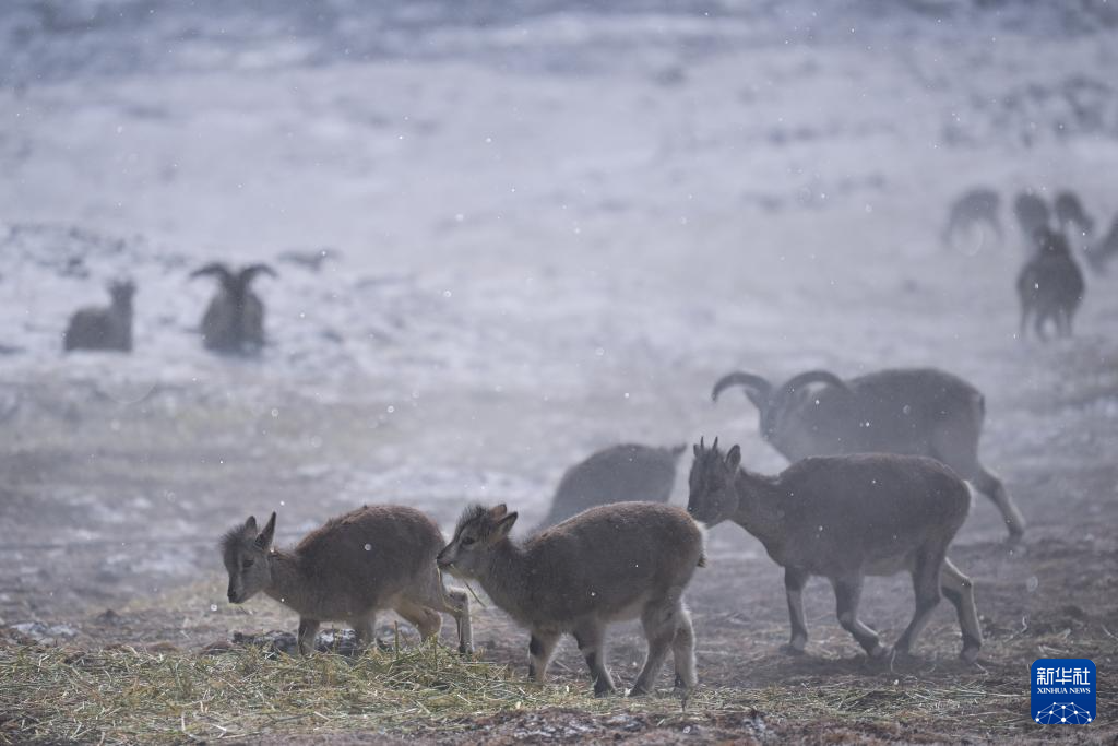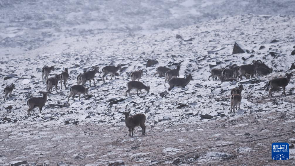 1月23日,幾只巖羊在青海省海北藏族自治州門源回族自治縣境內(nèi)的崗什卡雪峰活動(dòng)。新華社記者 張龍 攝