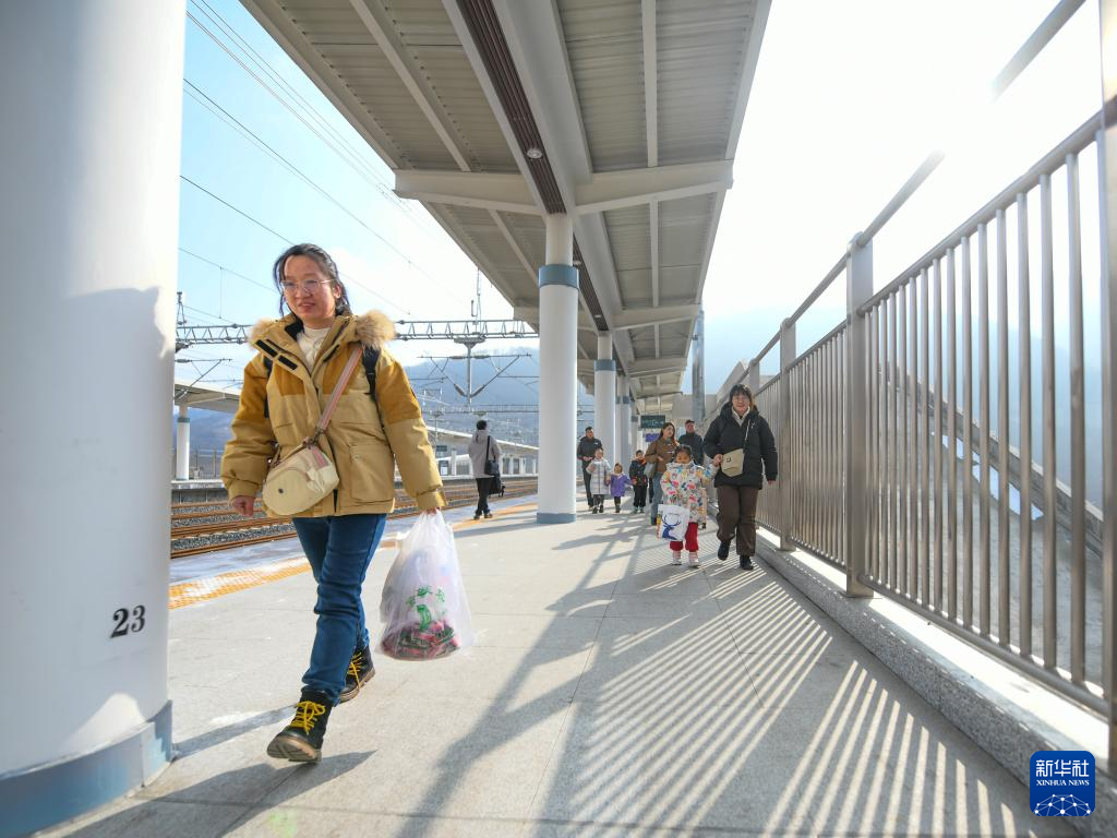 1月28日,在川青鐵路茂縣站,旅客帶著購買的牦牛肉和蘋果在候車。新華社記者 王曦 攝