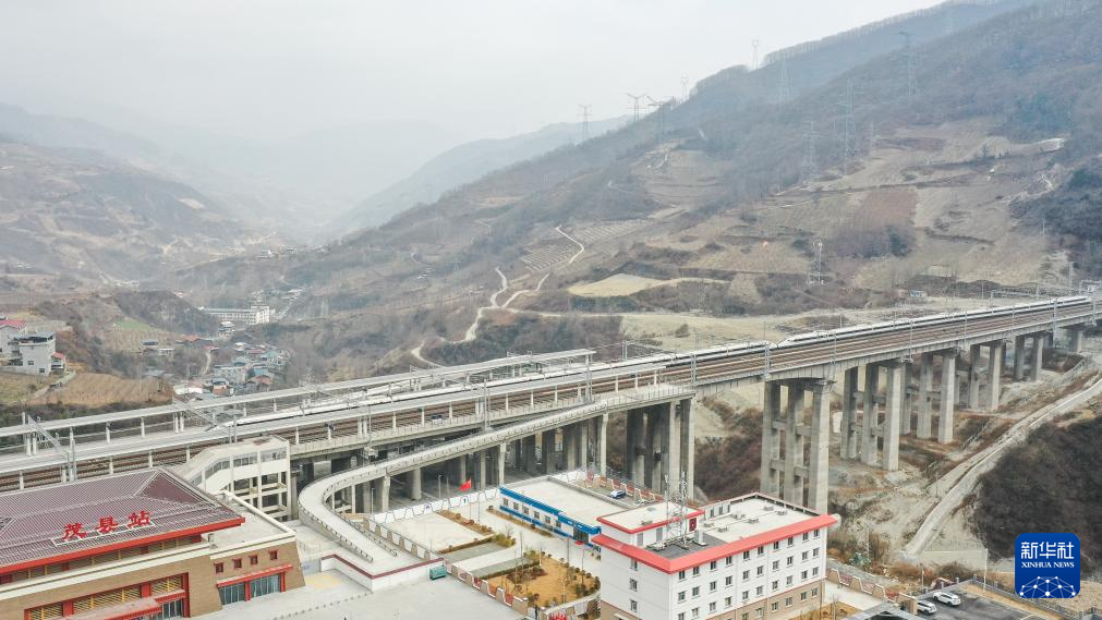 1月28日,一列動車組駛出川青鐵路茂縣站(無人機照片)。新華社記者 王曦 攝