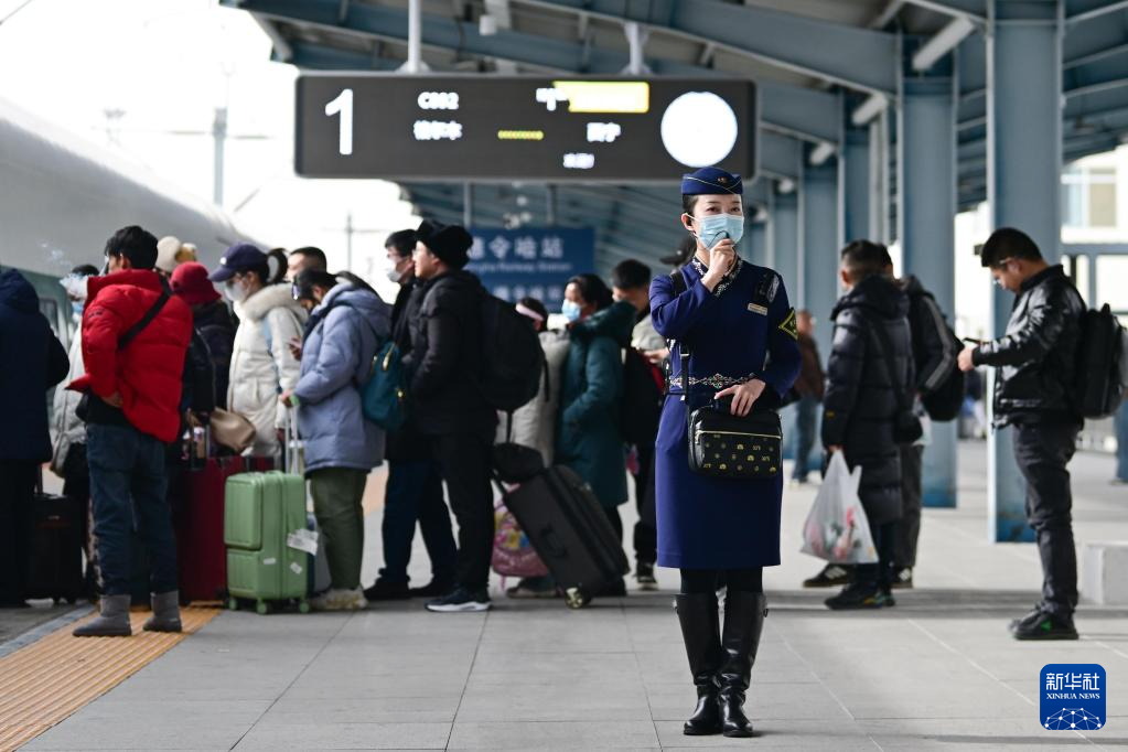 1月30日,中國(guó)鐵路青藏集團(tuán)有限公司西寧客運(yùn)段動(dòng)車(chē)隊(duì)乘務(wù)員王璐在站臺(tái)提示旅客登車(chē)。新華社記者 張龍 攝